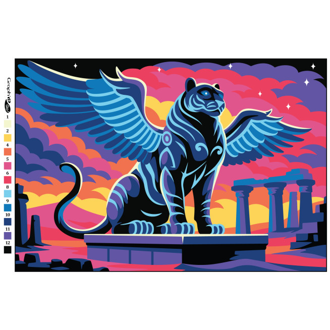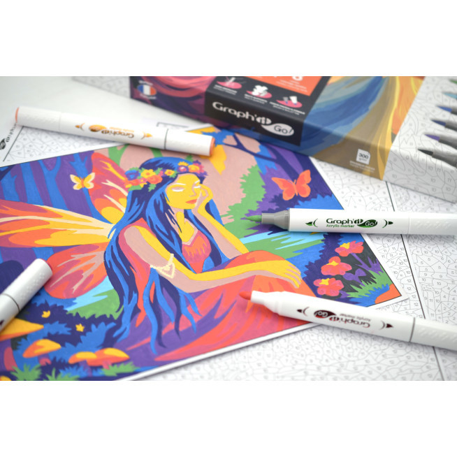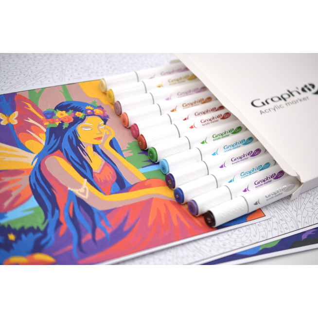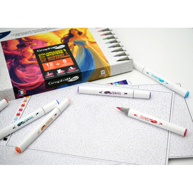 8 nagyméretű, rejtélyes színezőkártyát és 12 db GRAPH'IT GO akril filctollat tartalmaz.