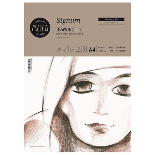 Az olasz Musa Signum rajztömbjei ideálisak grafithoz, színes ceruzához, szénhez és pasztellhez. Papírjai 200 g-os súlyának hála néhány vizes technikához is, mint például a gouache, tinta, és finomabb akvarellképekhez is alkalmas. Felülete nagyon enyhén textúrált, természetes fehér színű.