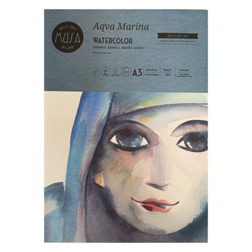A Musa Aqva Marina akvarellpapírja kiváló minőségű, 100% pamutból készült. A papír rendkívül erős és stabil, nem hullámzódik. Enyhén textúrált, természetes csontenyv felületkezeléssel. A színek élénken, ragyogóan mutatnak rajta, valamint igazán ellenálló, nem sérült.