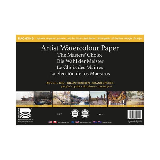 A Baohong akvarellpapírok 100% pamutból készültek, savmentesek. Természetes fehér színűek, optikai fehérítőt nem tartalmaz. A papírok 300 g súlyúak, érdes, erősen textúrált felületűek. Felülete igazán különleges, és egyedi, remekül bírja a különböző akvarell technikákat, a rétegzést, szín-visszaszedést is. Ezen kívül igazán jól bírja a maszkoló folyadékok, szalagok használatát is, ezek nem tépik vissza könnyen a papírt. Rengeteg vizet tart meg magában, nem hullámosodik. Rengeteg művész kedvence kiváló ár-érték aránya miatt. Tökéletes választás nem csak profiknak, hanem kezdőknek is.