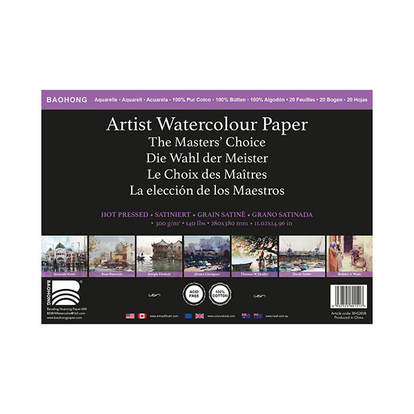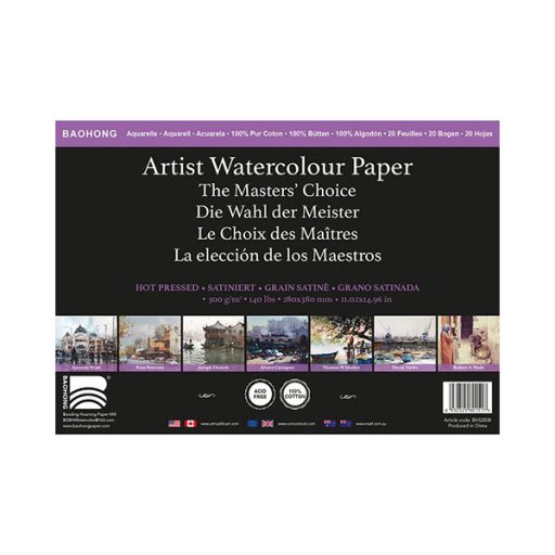 A Baohong akvarellpapírok 100% pamutból készültek, savmentesek. Természetes fehér színűek, optikai fehérítőt nem tartalmaz. A papírok 300 g súlyúak, melegen préselt, sima felületűek. Felülete igazán különleges, és egyedi, remekül bírja a különböző akvarell technikákat, a rétegzést, szín-visszaszedést is. Ezen kívül igazán jól bírja a maszkoló folyadékok, szalagok használatát is, ezek nem tépik vissza könnyen a papírt. Rengeteg vizet tart meg magában, nem hullámosodik. Rengeteg művész kedvence kiváló ár-érték aránya miatt. Tökéletes választás nem csak profiknak, hanem kezdőknek is.