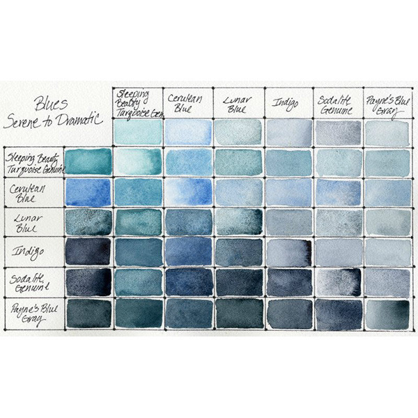 A 'Blues' készlet, mint a neve is mutatja többfajta kék árnyalatot tartalmaz, békés színektől egészen drámai árnyalatokig. Tartalmaz 4 különleges színt is, amelyek csak a Daniel Smith színskálájában találhatóak meg, ezek a Sleeping Beauty Turquoise Genuine, a Lunar Blue, a Sodalite Genuine és a Payne's Blue Gray. A készletben található színek sok lehetőséget adnak békés vizek és végtelen égbolt festésére.