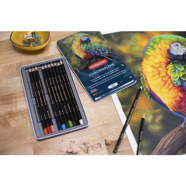 A Derwent Chromaflow színes ceruza puha, erősen pigmentált, amelynek hála vibrálóan mutat akár sötét papíron is. Krémes állaga miatt egységesen és gyorsan fel tudjuk vinni a papírra. Nehezen törik, könnyen keverhető, rétegezhető és árnyékoláshoz is tökéletes. Könnyebben radírhozató, mint más színes ceruzák, de teljesen azért ez sem visszaszedhető. A Chromaflow széria 72 színben érhető el, akár egyenként, akár különböző készletekben is.