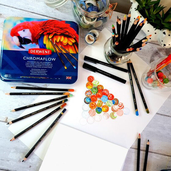 A Derwent Chromaflow színes ceruza puha, erősen pigmentált, amelynek hála vibrálóan mutat akár sötét papíron is. Krémes állaga miatt egységesen és gyorsan fel tudjuk vinni a papírra. Nehezen törik, könnyen keverhető, rétegezhető és árnyékoláshoz is tökéletes. Könnyebben radírhozató, mint más színes ceruzák, de teljesen azért ez sem visszaszedhető. A Chromaflow széria 72 színben érhető el, akár egyenként, akár különböző készletekben is.