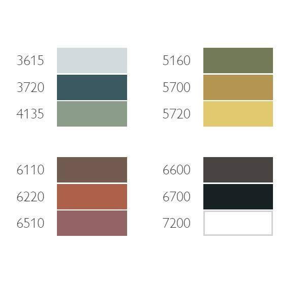 3615 Solway Blue, 3720 Ink Blue, 4135 Green Shadow, 5160 Olive Earth, 5700 Brown Ochre, 5720 Yellow Ochre, 6110 Sepia (Red), 6220 Sanguine, 6510 Ruby Earth, 6600 Chocolate, 6700 Ivory Black, 7200 Chinese White.
