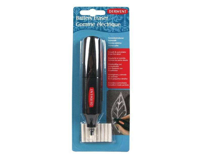 Precíziós és gyors radírozáshoz, javításokhoz. Használható grafit-, színes- és szénceruza rajzokhoz is. A csomag tartalmaz 8db pótradírt. Két darab AAA elemmel működik (az elemek nem részei a csomagnak). Az elektromos radírokban az a nagyszerű, hogy kis területről is könnyen vissza lehet radírozni több réteget, a legsötétebb részeket is. Természetesen vigyázni kell, hogy a papírt ne roncsoljuk el vele nagyon. Érdemes lehet „kihegyezni” a radírtöltet véget penge vagy dörzspapír segítségével így egészen vékony javítást is tudunk végezni vele vagy hajszálakat „rajzolni”.