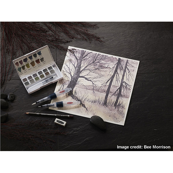 A Derwent Graphitint akvarellfestékei igazán egyediek, hiszen grafitporral vannak keverve. Színei tompák, finom grafitos ragyogással. Ideális mix media munkákhoz. A színpalettában találhatóak hideg és meleg árnyalatok is, finom grafitporral keverve, amelyek megülnek a papír felületén, így különböző effekteket létrehozva. Ezek legjobban a hidegen préselt akvarellpapíron mutatkoznak meg, ahol előjön a festékek granulációja, a színek finom, különleges átmenete. Ezek a gyönyörű természetes színek ideálisak főként tájképek és városi tájképek festésére. A 12 db Graphitint szilke mellett a készlet tartalmaz még egy mini vízzel tölthető ecsetet és egy szivacsot is. A műanyag doboz teteje pedig palettaként is szolgál, 5 különböző résszel elkülönítve.