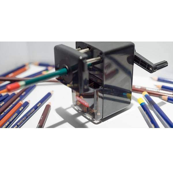 A Derwent Super Point Mini hegyező segítségével hihetetlenül hegyes ceruzáid lehetnek, hogy minél aprólékosabb részleteket tudj kidolgozni! Ebben elsőosztályú spirális acélpengéje segíti, a használata pedig nagyon kényelmes, mivel az asztal széléhez tudod rögzíteni, így nem fog elmozdulni a hegyezés közben. Tartálya könnyen üríthető, így tisztán tartása sem okoz gondot. Akár 8 mm-es átmérőjű ceruzákkal is elbír!