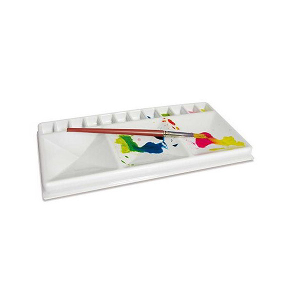 A DOM műanyag paletta 12 kisebb részt tartalmaz a festékek kinyomására, valamint 3 nagyobb részt a színkeveréshez. Alkalmas bármilyen vizes bázisú festékhez, tintához. A paletta teljes mérete 31 x 14,5 cm.