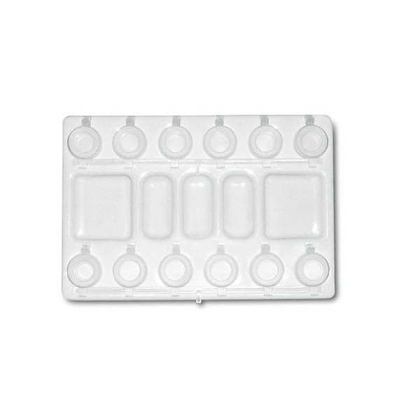 A DOM műanyag paletta 5 keverő résszel, valamint 12 csukható tégellyel rendelkezik. Ezekbe kinyomhatod tubusos akvarell, és gouache festékeid, könnyű, egyszerű tárolást és használatot biztosítanak. A paletta keverő része bármilyen vízbázisú festékhez, tintához alkalmas. A paletta teljes mérete 16 x 23 cm.