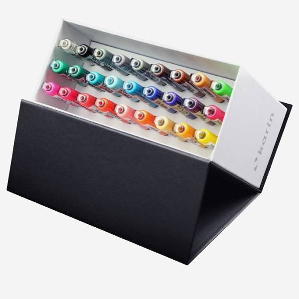 Karin Brushmarker PRO ecsetfilc Minibox (26 szín + blender)A Karin Brushmarker PRO markerei a szuper tartós és kiváló minőségű, hajlékony japán nylon ecsethegynek köszönhetően ideálisak a hand letteringhez. 60 különböző színben érhető el. Az ecsetfilcek 2,4 ml nem toxikus, intenzív festéket tartalmaznak. A speciális gyártási technológiának köszönhetően a festék színének intenzítását az utolós cseppig megőrzi. A festék vízalapú, így a színek könnyedén keverhetőek, világosíthatóak és átmenetes hatásokat lehet vele elérni, ha a különböző színű filcek hegyét összeérintjük.