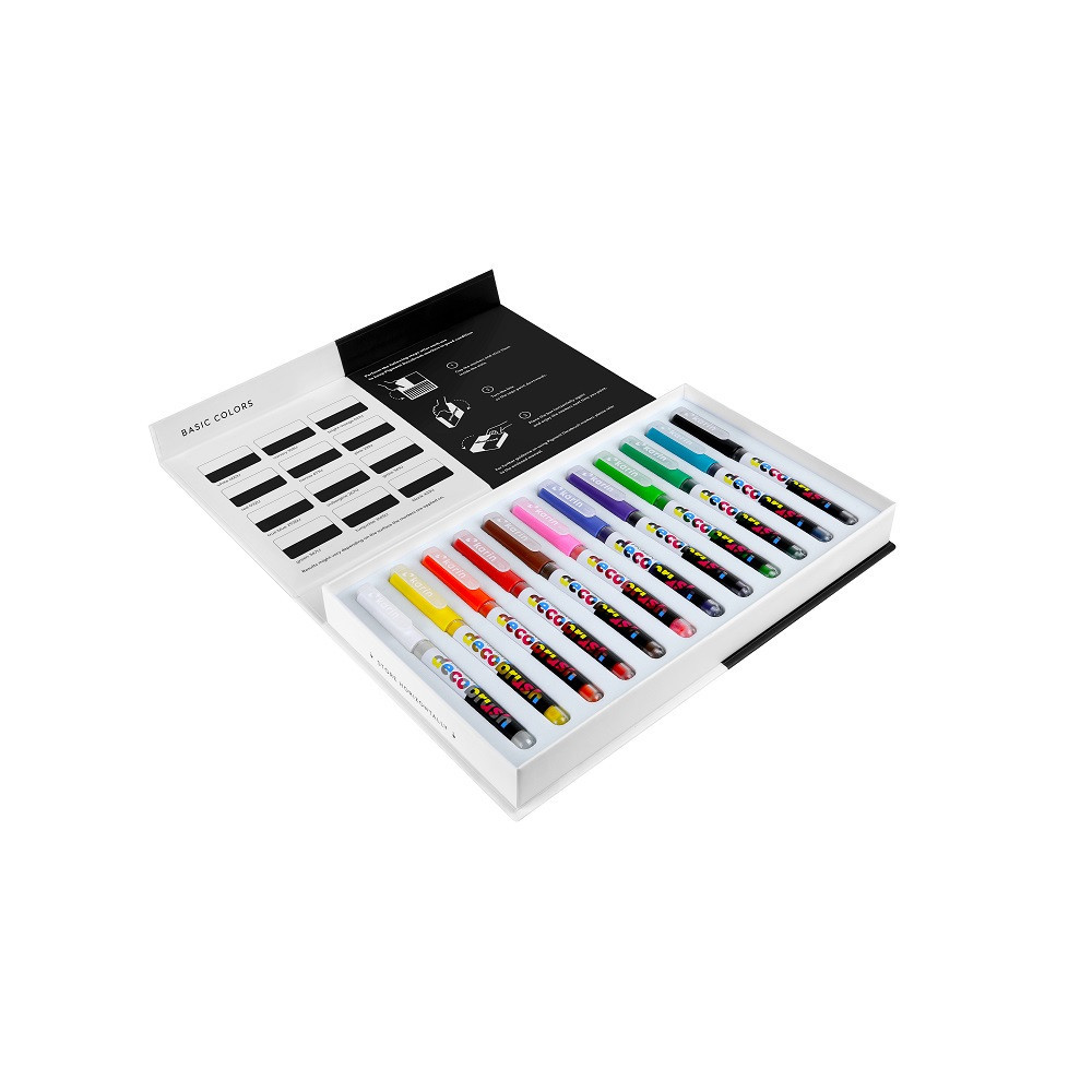 A tökéletes fedés és a különleges színek biztosítják, hogy egyedi feliratokat készíthess velük. Az ecsetfilcek 2,4 ml akril, nem toxikus, szerves alapú festéket tartalmaznak. A hosszú élettartamért a filceket mindig vízszintesen tárold!