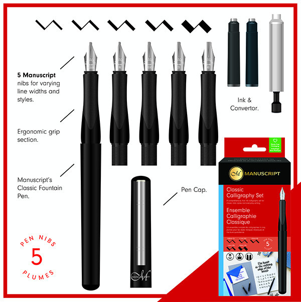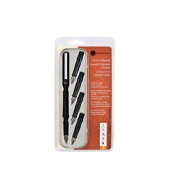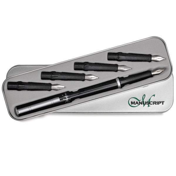 Manuscript klasszikus kalligráfia töltőtoll készlet A klasszikus töltőtoll készlet a kezdő és haladó kalligrafáló igényeit is kielégíti. A minőségi fém hegyeket szakértő mérnökök készítik Angliában.