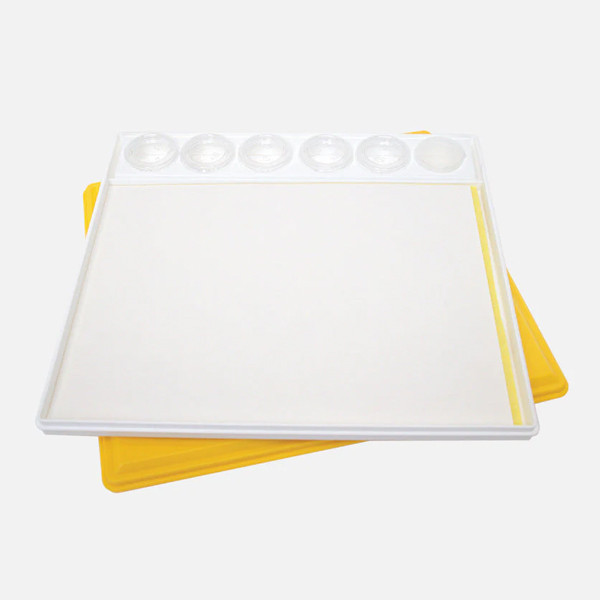 A Masterson Sta-Wet nedves palettákat az elpocsékolt festékek ellen hozták létre! Több, mint 25 éves munkásságuk során a Masterson paletták páratlanok funkcionalitásukat tekintve. Ez a paletta segít benne, hogy akril és más vizes bázisú festékeid hosszú időn keresztül használni tudd, ne száradjon rá a palettára már pár perc után. A műanyag palettában egy szivacsot és egy papírt találsz, ezek segítenek a festékek vizesen tartásában. Nyitva órákon keresztül is használhatod festékeid, de fedelének légmentes záródásának köszönhetően akár napokra félre rakhatod! A csomagban 5 db papírpalettát találsz, amelyen könnyen tudsz színeket keverni is. A palettán 6 külön részt is találsz, hogy legtöbbet használd színeidből többet is ki tudj nyomni egyszerre.