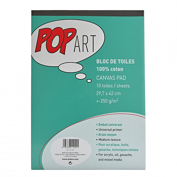 A Pébéo 100% pamut vászon univerzális alapozással rendelkezik, ideális választás akrilfestéshez, olajfestéshez és goauche-hoz is. Rövidebb oldalán ragasztott, 250 g-os pamutlapokat tartalmaz.Kétféle méretben kapható, az A4-es 20 db, míg az A3-as 10 db ívet tartalmaz.