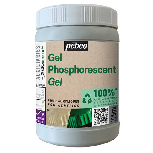 A Pébéo foszforeszkáló gél elnyeli a természetes és a mesterséges fényt is, és ennek köszönhetően világít sötétben. A gél magában átlátszó, majd sötétben zölden világít. Száradás után szatén-matt felületű lesz. Érdemes minél vastagabb rétegben, festőkéssel felvinni.
