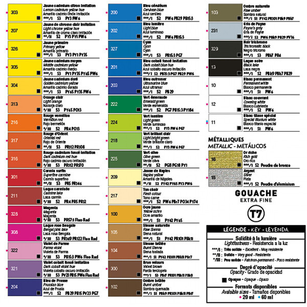 A Pébéo T7 gouache festék stúdió minőségű, ideális választás diákoknak, művészeknek is. A festékek száradás után matt, bársonyos felületet alkotnak, vízzel visszaoldhatóak. Kiváló fedőképességük miatt tökéletesek nem csak fehér, hanem sötét színű alapokon is. Krémes állaga miatt könnyű és egy igazi élmény a használata, pontos, precíz festést tesz lehetővé. Színei igazán gazdagok, intenzívek, amelyet a kiváló minőségű pigmenteknek köszönhetnek.