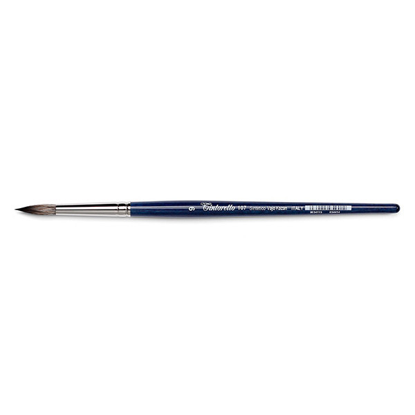 A Tintoretto 107-es szériájú ecsete szintetikus szálakból készült, azonban mégis egy igazán kiváló imitációja a mókusszőr ecseteknek, nem csak kinézetben, hanem tulajdonságaiban is. Az ecsetek nagyon puhák, és remek a szín-és vízmegtartó képességük. Rendkívül jól őrzi formáját, és hegyességét, amely miatt rengetegféle módon használható. Tökéletes választás vizes bázisú festékek használatánál, vagy akár kerámiák festéséhez is. Kerek formájú ecset, 16 különböző méretben.