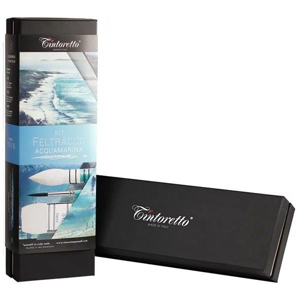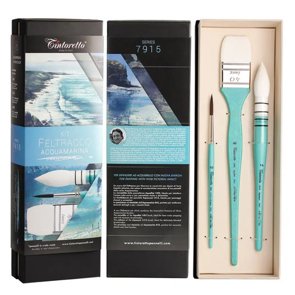 A Tintoretto Feltracco Aquamarine ecsetkészlete a művész 3 kedvenc ecsetét foglalja magában, egy gyönyörű díszdobozban.