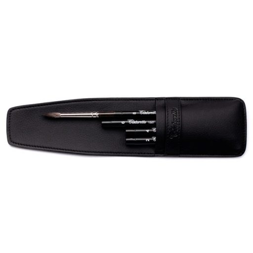 Kerek formájú utazó ecsetek, praktikus, strapabíró bőrtokban. A készlet 2, 4, 6 és 8-as méretű ecseteket tartalmaz.