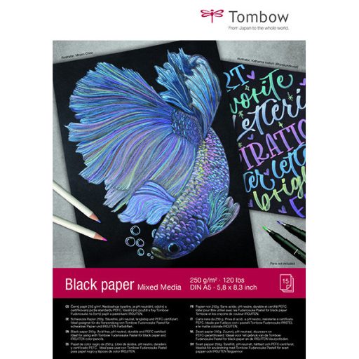 A Tombow fekete lapos mixed media tömbje igazán sokrétűen felhasználható, ideális választás ceruzához, markerekhez, ecsetfilceket és festéshez is. 250 g-os, sima felületű papírja igazán strapabíró és időtálló. A tömb A5-ös méretű, 15 lapot tartalmaz, rövidebb oldalán ragasztott.