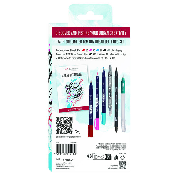 A Tombow Urban Lettering készlete tökéletes kombinációja az elegáns kalligráfiának és a modern betűírásnak. Iván Caiña spanyol művésszel közösen hozták létre ezt a készletet. A készletben található Fudenosuke ecsetfilcek kezdőknek is ajánlottak, míg az ABT filcet már kicsit tapasztaltabbaknak alkalmasak. Ahhoz, hogy szövegeidnek igazán különleges hatást adj, használd a tölthető ecsetet akvarellel, vagy akvarell ecsetfilcekkel! A készlet egy rövid leírást, inspirációs szórólapot is tartalmaz.